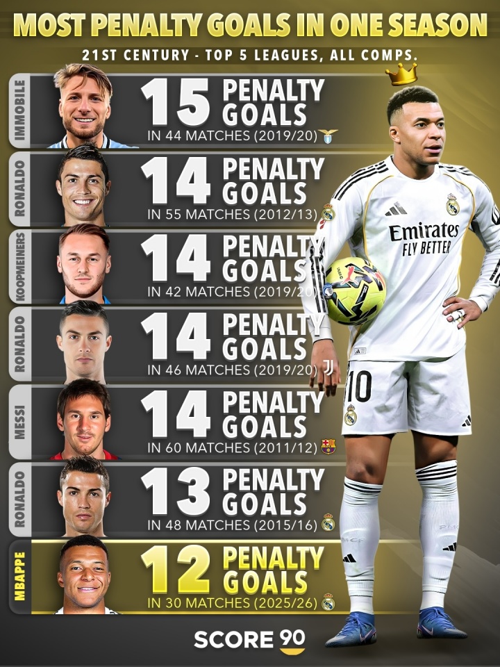 02月03日讯 Score90统计了21世纪五大联赛球员单赛季最多点球进球榜,姆巴佩本赛季至今目前以12粒点球位居第七位。